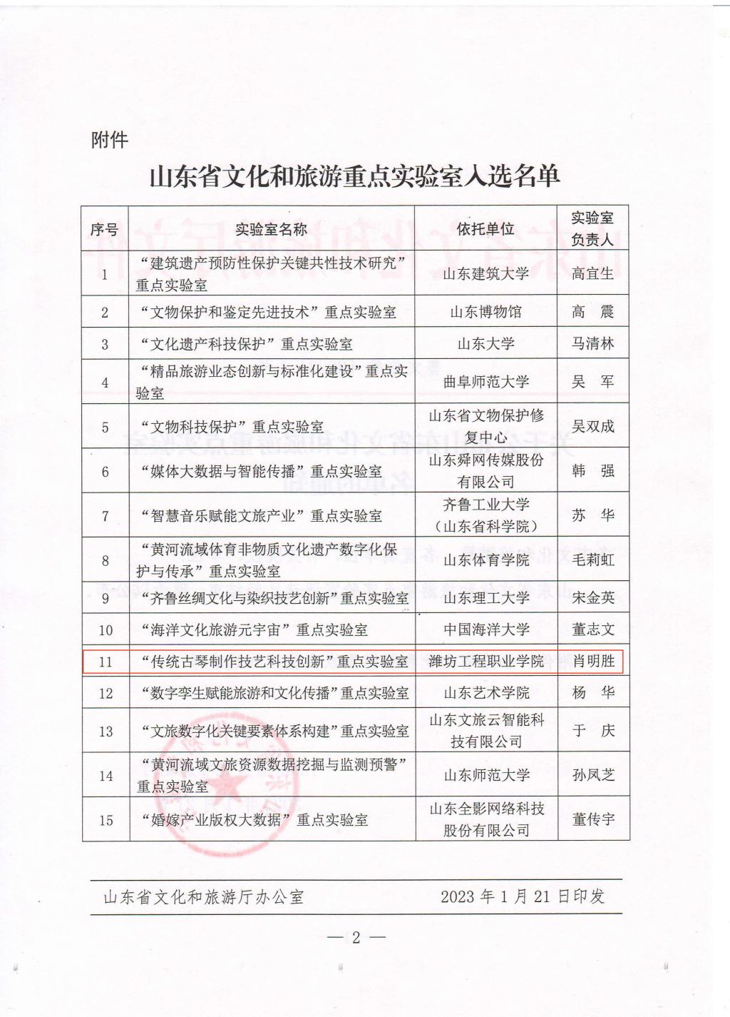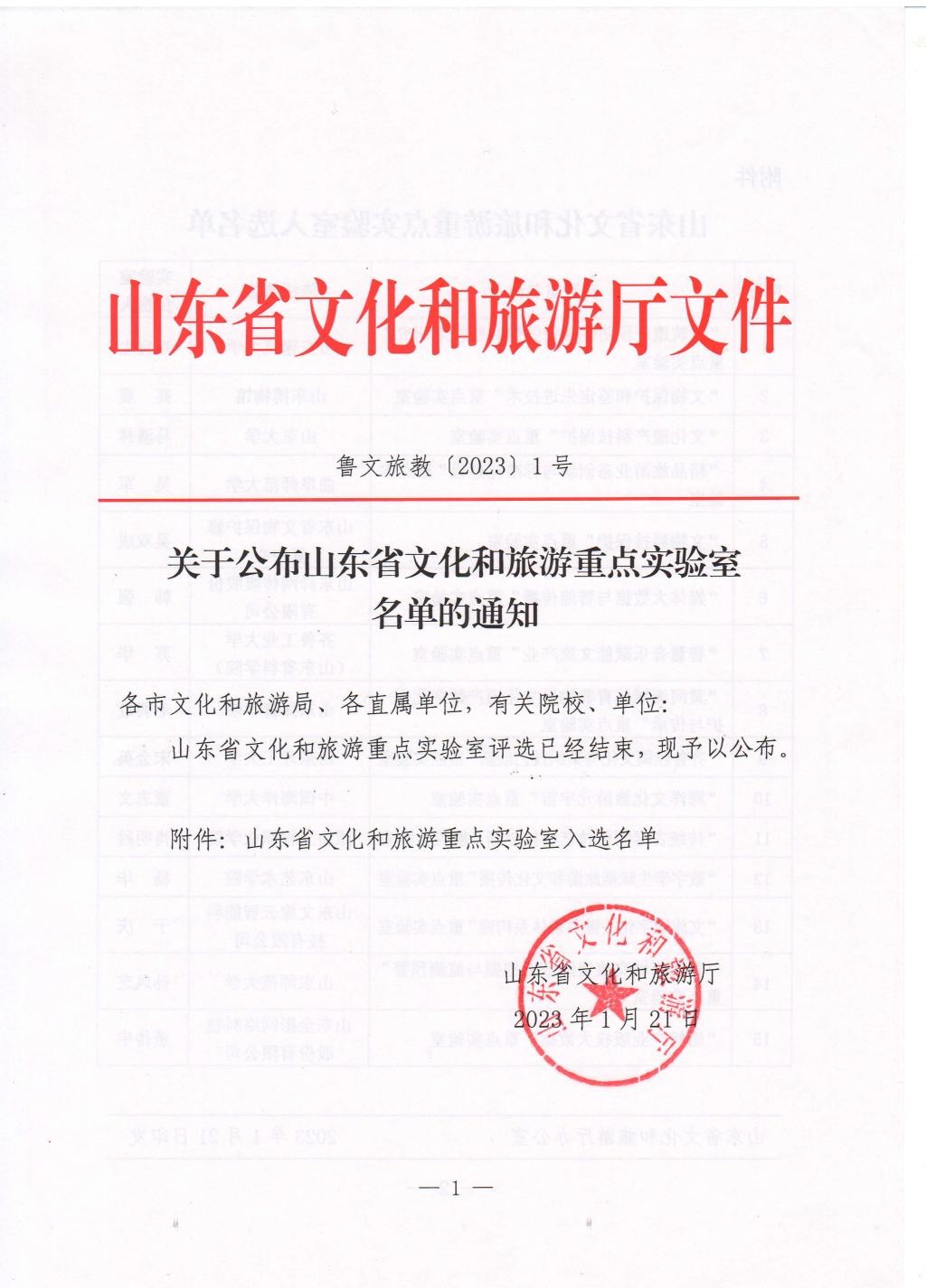 2023年山东省文化和旅游重点实验室