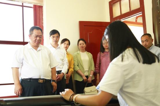 邵阳职业技术学院党委书记邓政,党委委员、副院长王金明在古琴文化博馆听学生弹奏古琴