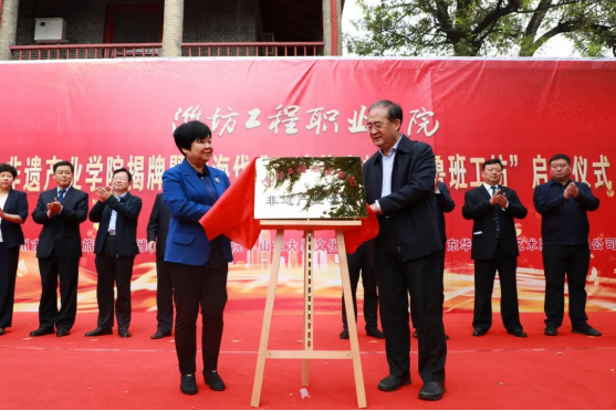 2021年10月10日上午,潍坊工程职业学院非遗产业学院揭牌仪式在玲珑校区举行,潍坊市政府副市长马清民和青州市委副书记、市长宋伟伟为潍坊工程职业学院非遗产业学院揭牌。山东省文化和旅游厅非物质文化遗产处副处长蒋士秋,潍坊市文化和旅游局党组书记、局长权文松,齐鲁文化(潍坊)生态保护区服务中心主任高增光,潍坊市畜牧业发展中心副主任张守兵,潍坊市产教融合研究院院长田元训,青州市副市长曹升曦,青州市文化和旅游局局长杨爱东,潍坊工程职业学院党委书记肖明胜、院长高立伯以及其他院领导、中层干部、企业家代表、教师和学生代表100余人参加揭牌仪式。揭牌仪式由副院长王金明主持。